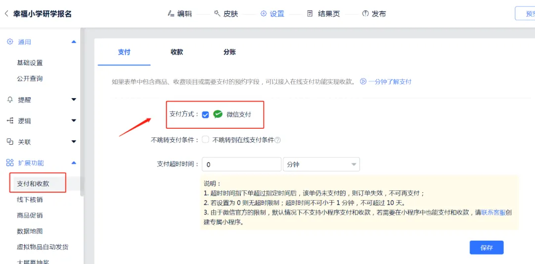 2.开启表单大师“在线支付”功能,家长填写表单时,便能一键支付,无需老师介入,资金不走表单大师平台,直接由微信或支付宝分账到企业账户。