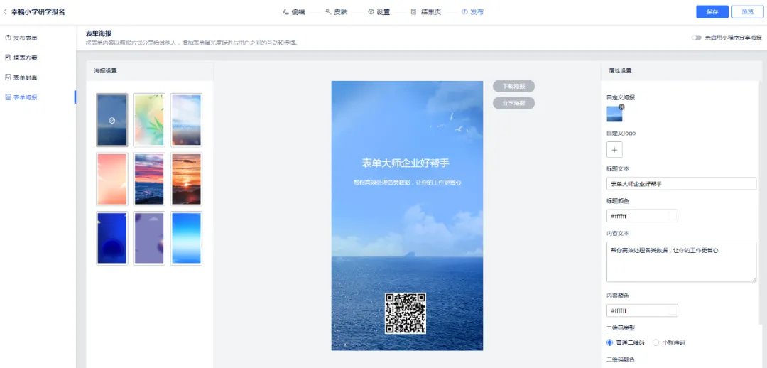 5.开启海报分享功能。企业可以将表单内容以海报形式分享到家长群中,展示活动信息,家长扫码就能填写表单,更直接高效。