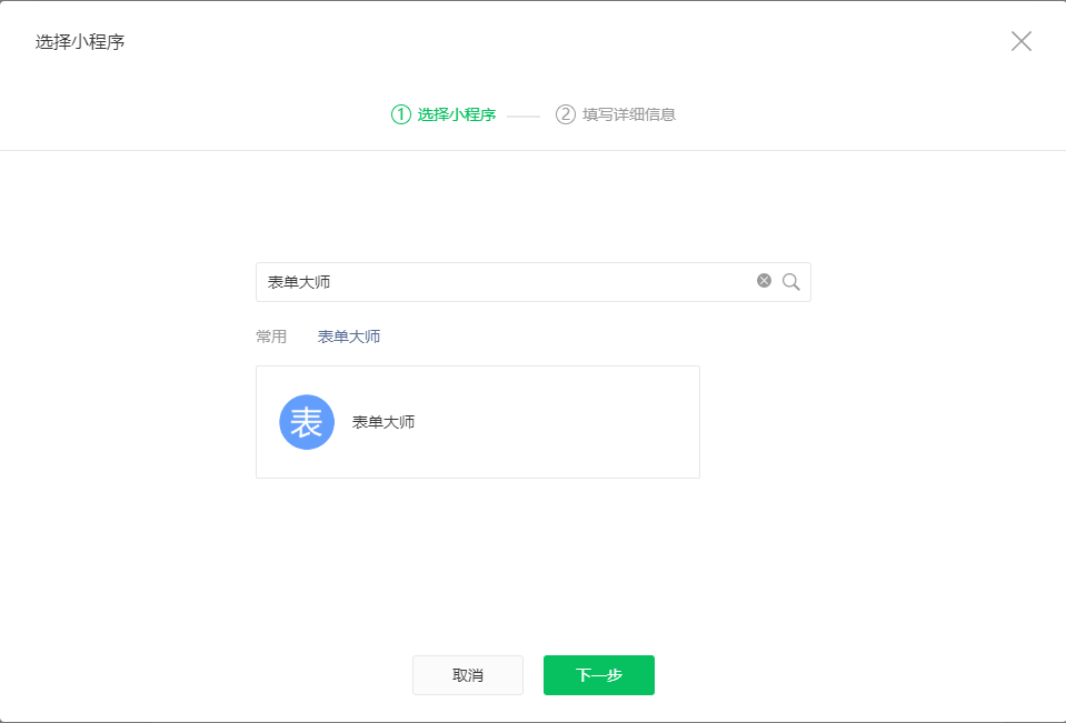 验证成功后,直接在搜索框内输入「表单大师」,就会出现「表单大师小程序」,点击“下一步”就表示已经关联成功,接下来就可以直接在微信公众号文章内嵌入「表单大师小程序」了。