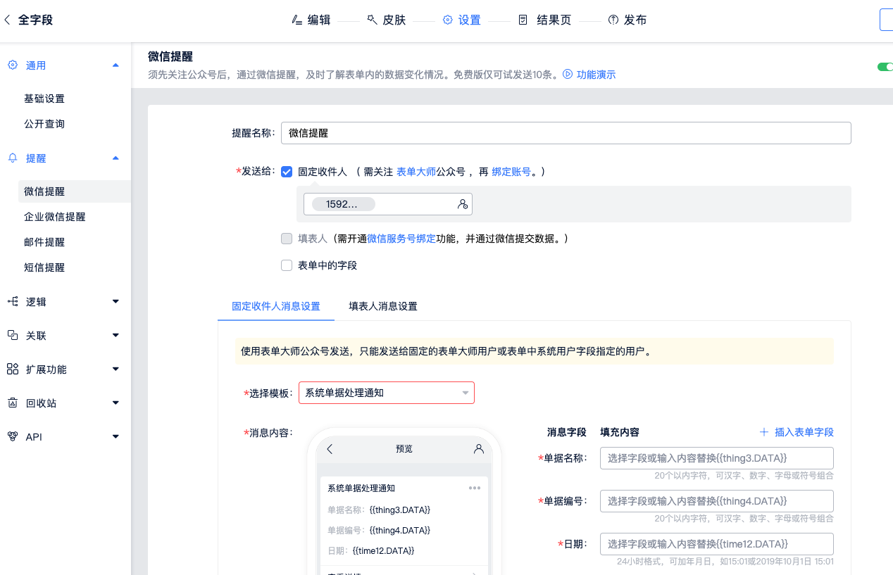 - 表单大师免费版用户微信提醒数超过10条后,则无法进行提醒;