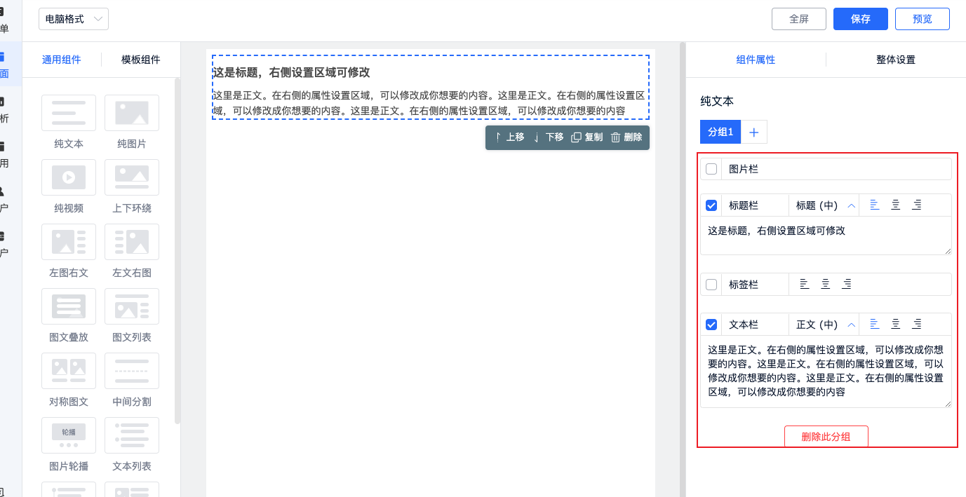 如果模板中的组件无法满足需求,可以另行在通用组件中增加若干组件。添加组件后,在右侧组件属性和整体设置中进行内容和样式设置。