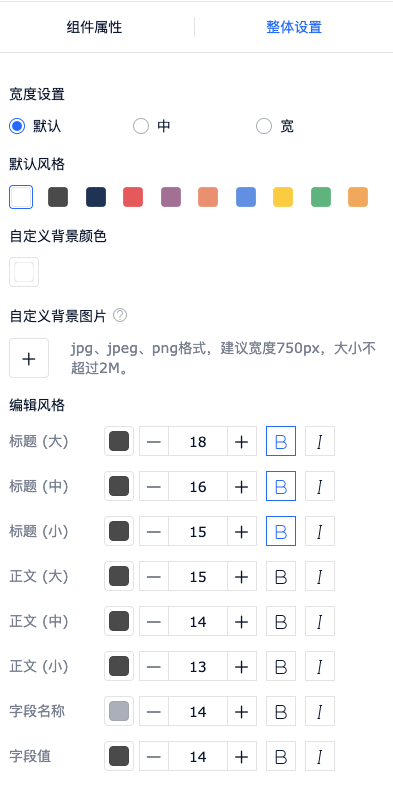整体设置:整体设置主要控制的是模板整体的颜色、背景图片、标题及正文字号大小和颜色、页面宽度等设置。在此处设置好后,组件属性应用即可。