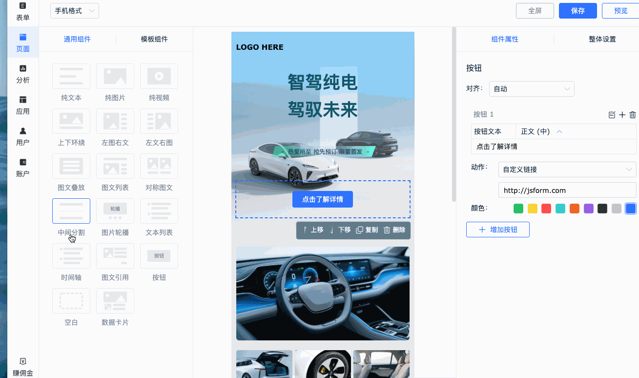 组件属性:每个组件都可以单独设置对应的组件属性,比如文本内容、字号大小、颜色、位置、上传图片、跳转链接等。