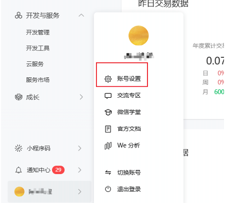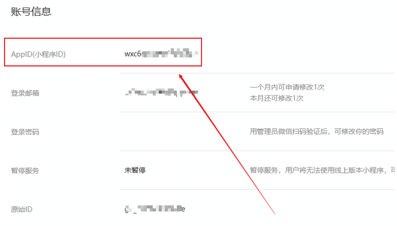 登录微信公众平台,获取到小程序ID: https://mp.weixin.qq.com/ ,左侧底部小程序名称-账号设置点进去后,找到账号信息中的APPID(小程序ID)。