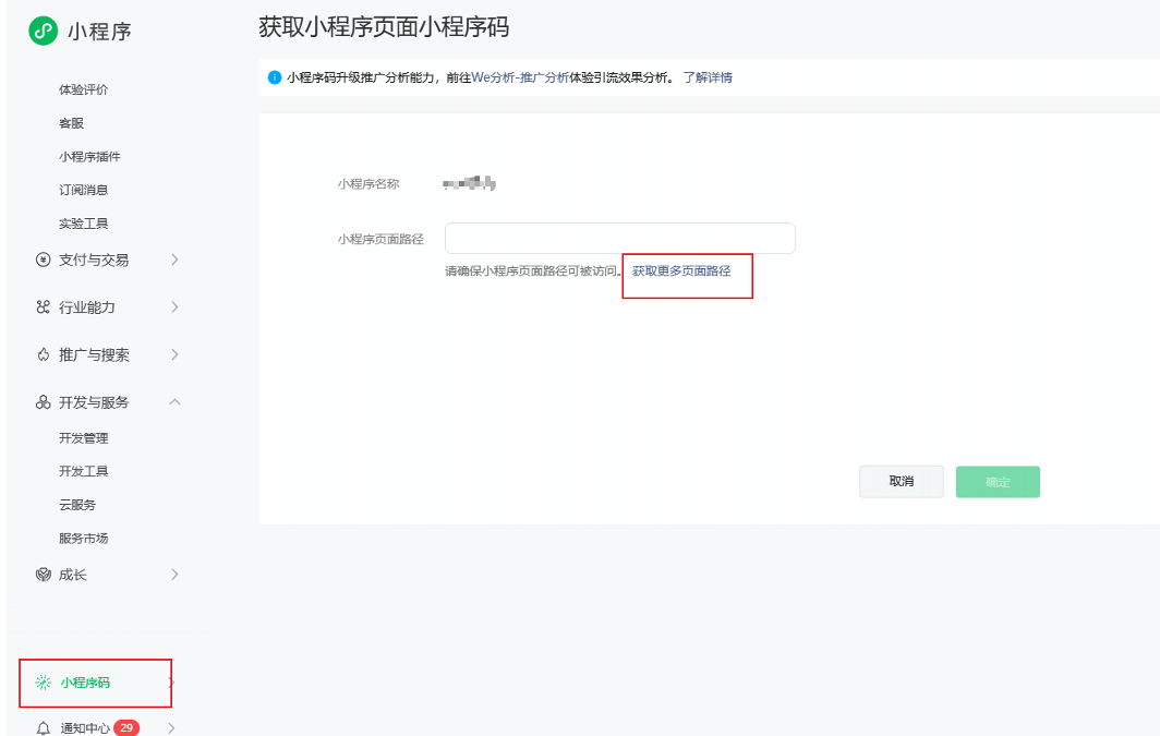获取页面路径,点击左侧小程序码-获取更多页面路径,按页面操作提示输入小程序成员微信号,在小程序上去复制页面路径。此处已有官方文档,可参考文档去获取页面路径:https://kf.qq.com/faq/180725biaAn2180725VnQjYF.html