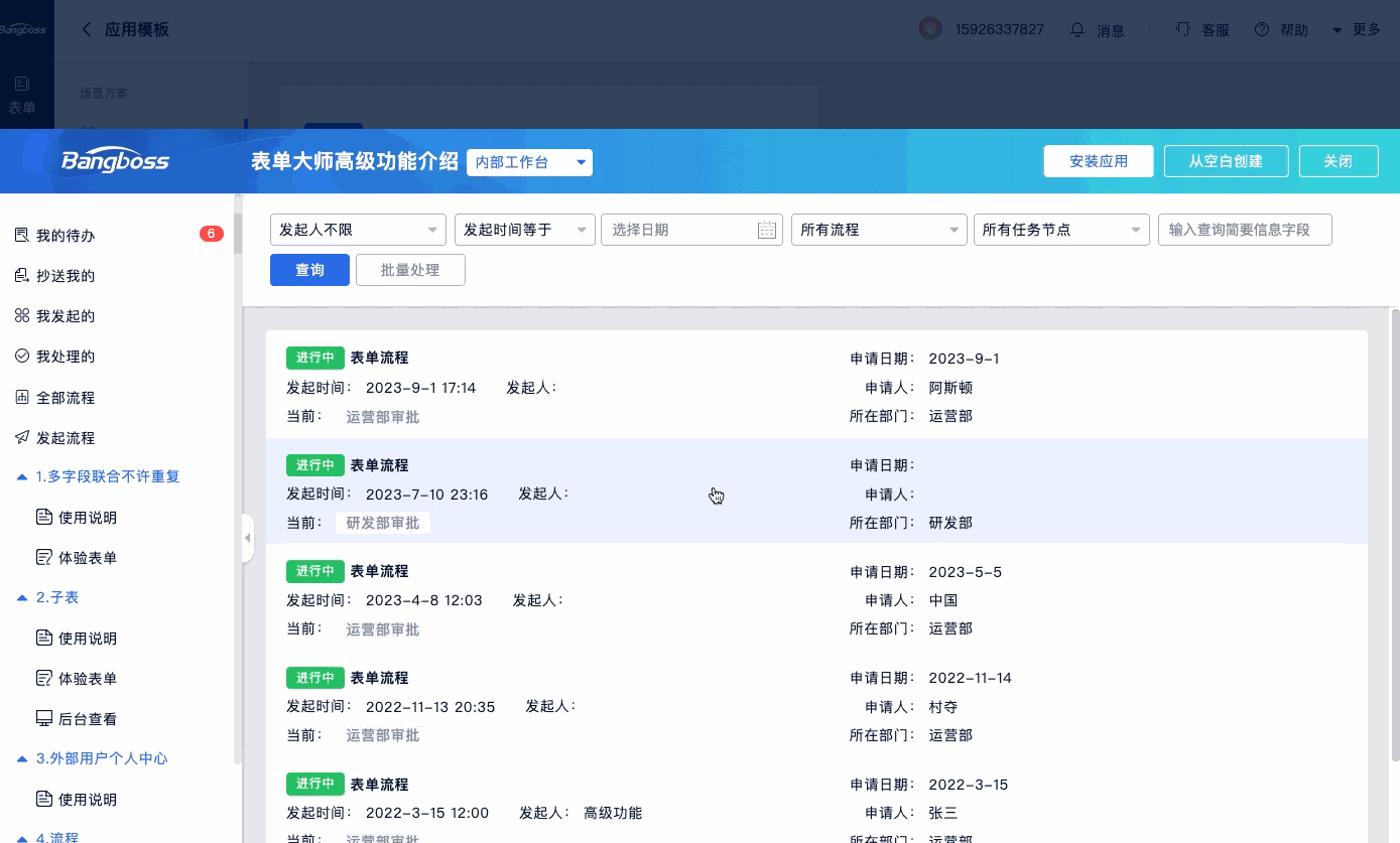不清楚如何搭建应用实现想要的功能时,可以选择使用模板来创建应用模板。模板中心有近上百套覆盖各种办公场景的模板,可以有效的满足不同场景的使用需求。安装成功后,表单列表分组中会相应的生成应用模板中使用到的表单。