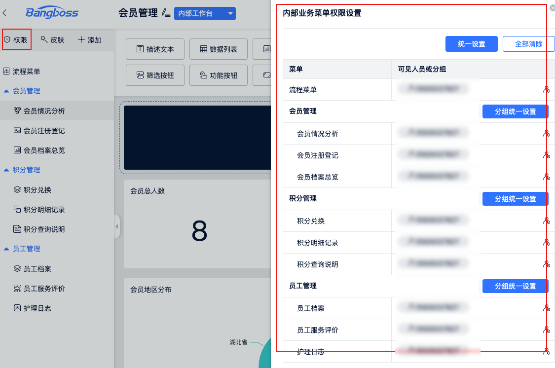 针对内部应用中每个菜单的可见权限设置。