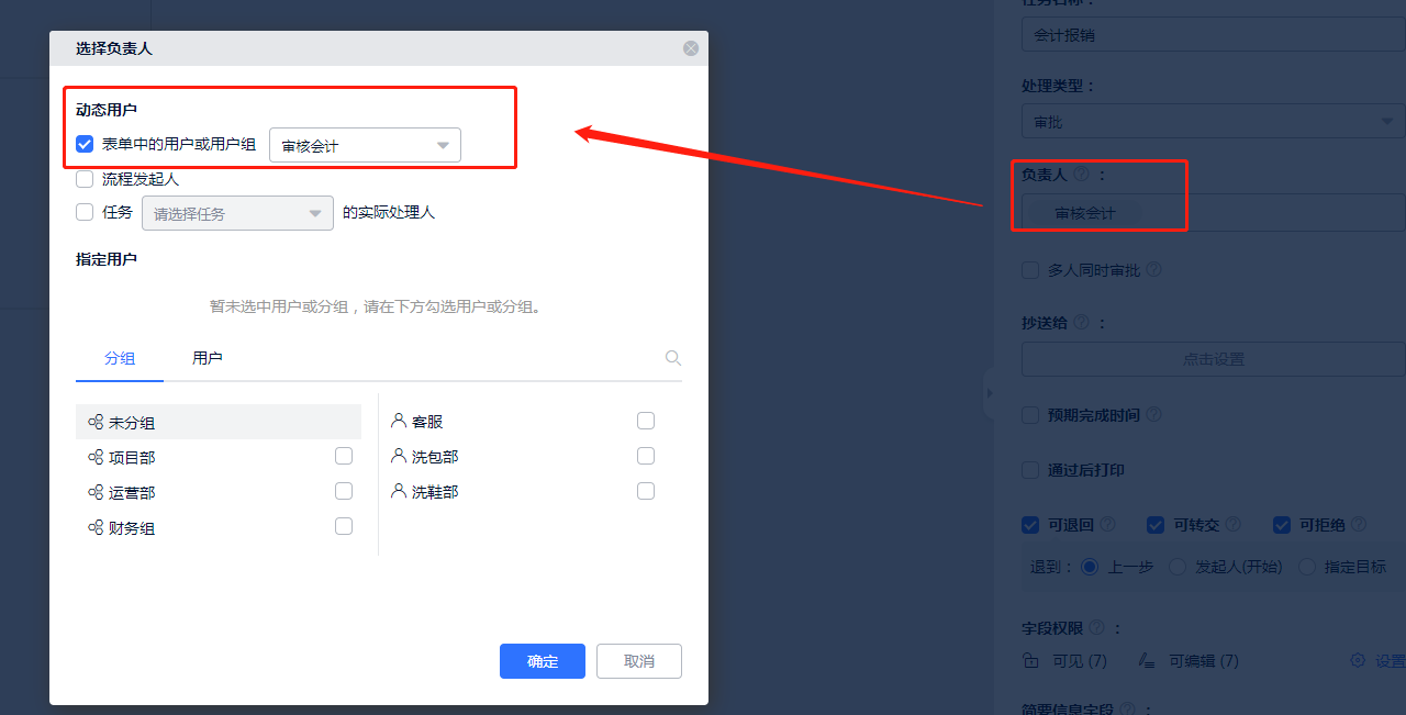以报销流程为例,在「财务审批」节点中将「审核会计」字段设置成可见可输入,然后将「会计报销」节点的负责人设置为「审核会计」。
