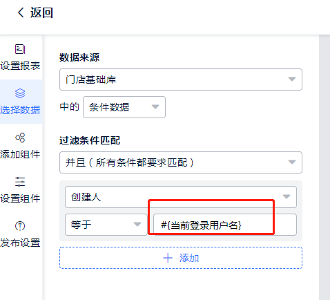 你希望按照哪个字段实现动态报表,则选择相应的字段设置过滤条件,条件值输入表达式“${key}”
