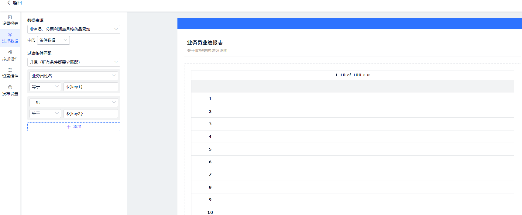 步骤2: 在报表中设置过滤条件,这里演示的是多个条件,如果只有一个条件则为key值,无key1、key2。